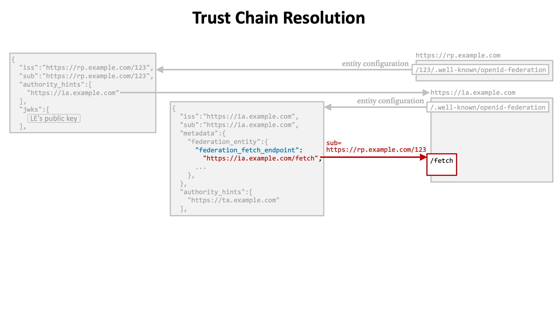 For example, when an intermediate authority https://ia.example.com provides its federation fetch endpoint at https://ia.example.com/fetch, a JWT that indicates that the intermediate authority authorizes a federation entity https://rp.example.com/123 can be obtained by making the following HTTP request.