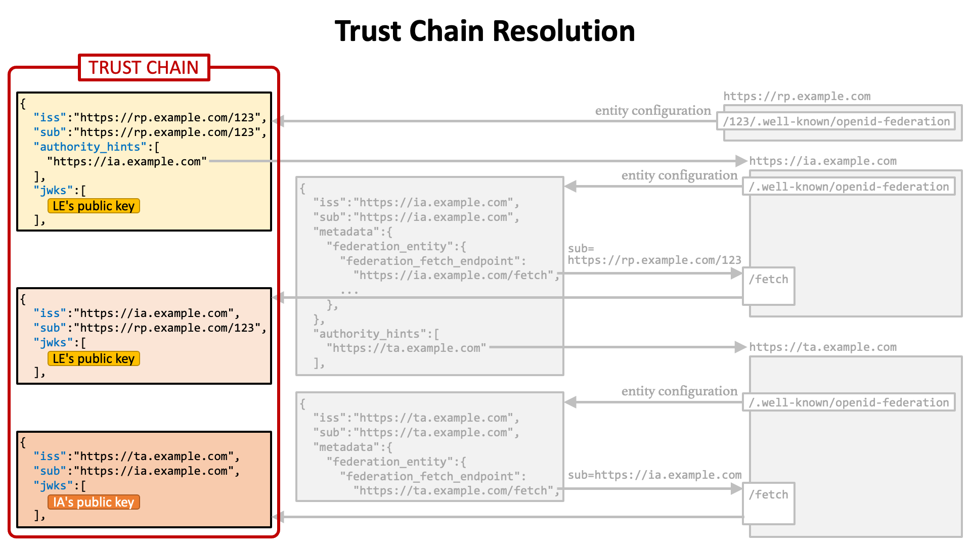 Technically speaking, a trust chain is a sequence of JWTs (RFC 7519 JSON Web Token) that are issued by a leaf entity, zero or more intermediate authorities, and a trust anchor.