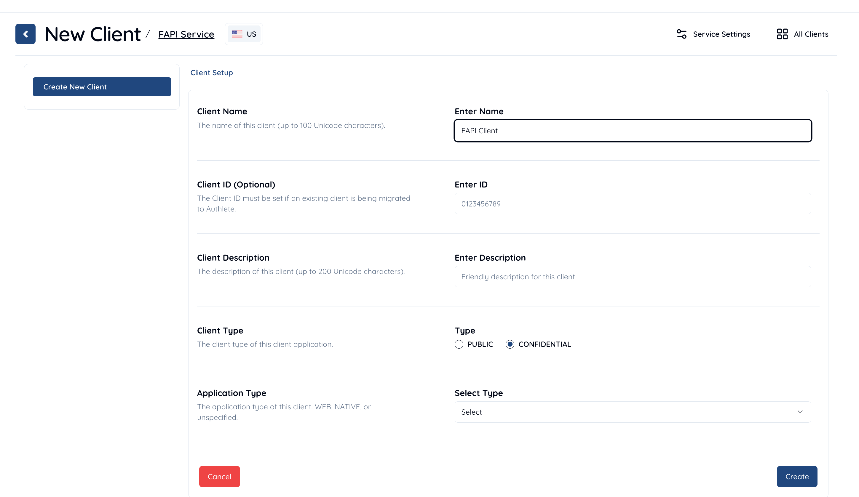 In the Authlete Management Console, locate and click on your FAPI Service, then click the Create Client button.