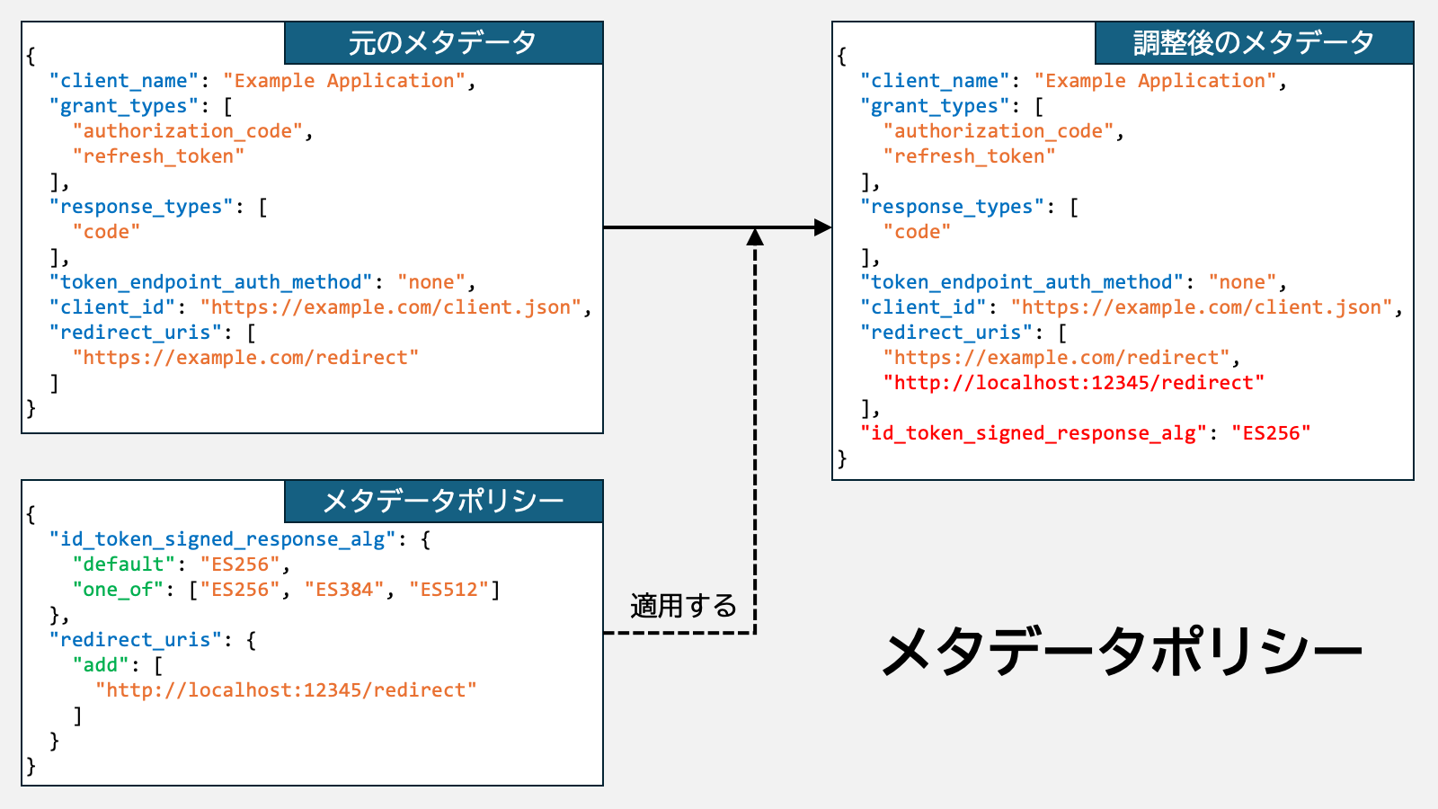 このクライアントメタデータに対して、次のメタデータポリシーを適用すると、