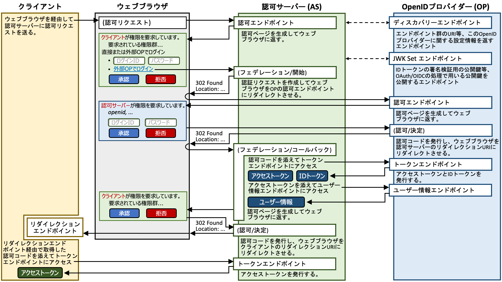 Location ヘッダーをつけて 302 Found (リダイレクションを促すものであれば何でもよい) をウェブブラウザに返す。これによりウェブブラウザは IdP の認可エンドポイントに認証リクエストを送ることになる。Location ヘッダーをつけて 302 Found (リダイレクションを促すものであれば何でもよい) をウェブブラウザに返す。これによりウェブブラウザは (クライアントのものではなく) AS のリダイレクション URI に認可コード付きでアクセスする。IdP の視点からは、AS はクライアントアプリケーションであり、当該リダイレクション URI は AS が事前に IdP に登録しておいたものの一つである。Location ヘッダーをつけて 302 Found (リダイレクションを促すものであれば何でもよい) をウェブブラウザに返す。これによりウェブブラウザは (AS のものではなく) クライアントのリダイレクション URI に認可コード付きでアクセスする。ここではクライアントが少なくとも一つのリダイレクション URI を事前に AS に登録済みであることを想定している。次の節では、Okta を IdP として設定し、Authlete をバックエンドとして用いる AS (java-oauth-server) と連動させて上図のフローを実現する方法を紹介します。