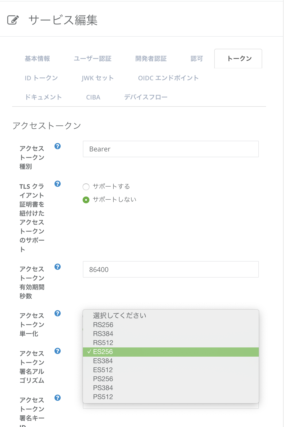 登録後、「トークン」タブに移動し、適切な「アクセストークン署名アルゴリズム」を選択します。たとえば ES256 の署名鍵を登録した場合(上記の記事の例)には、「ES256」を選択します。