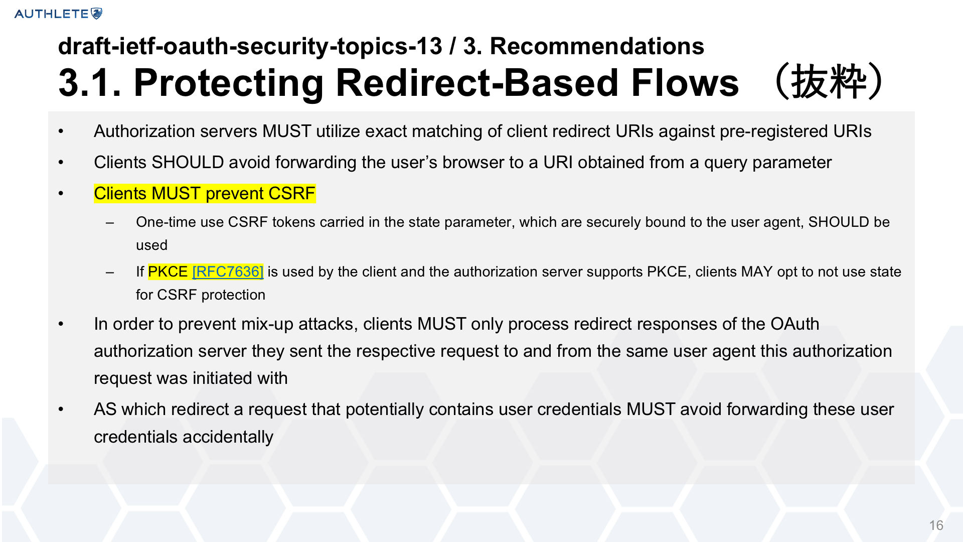 認可コードフローを使う場合には public だろうが、confidential、つまりクレデンシャルをちゃんと持っておけるような、(たとえば)Web サーバーのクライアントであったとしても、PKCE を使いましょうというのが、この BCP で書かれています。