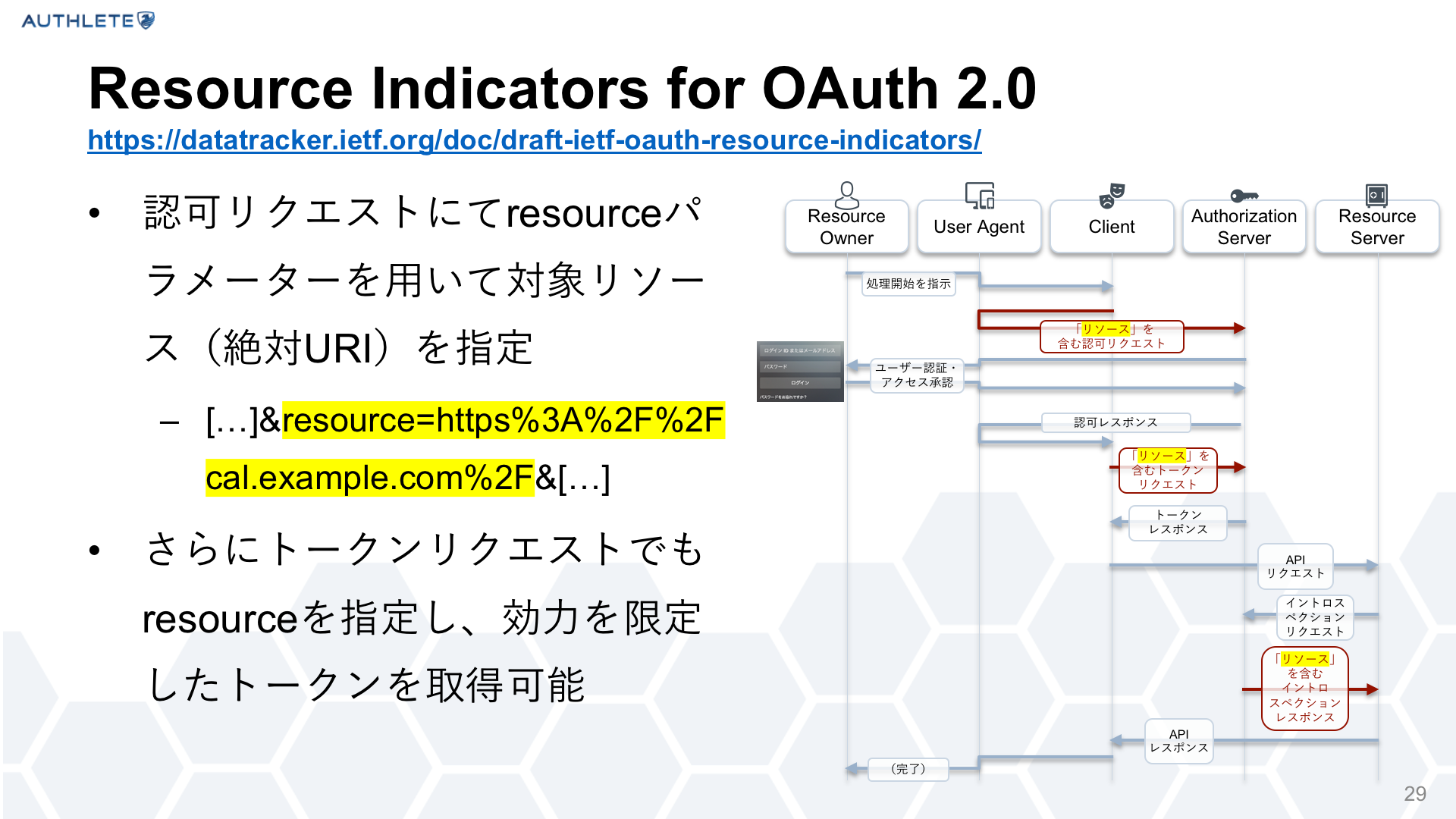 っていうパラメーターを認可リクエストに含んで送る、と。 かつ、認可コードが戻ってきてトークンリクエストをするときにも同じように、この resource