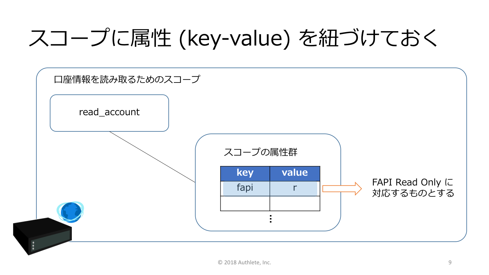 ちょっと認可サーバーの頭の中を覗くようにイメージしてほしいんですけど、 認可サーバーの中にスコープがいくつか定義されている中に、 read_account