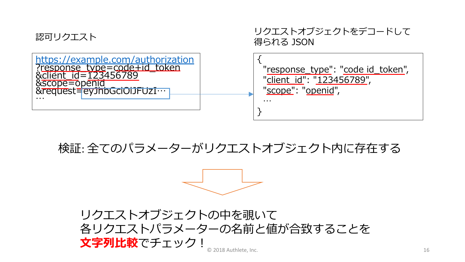 これを日本語に訳すとですね、 すべてのパラメーターが、署名された Request Object 内に存在するということを、認可サーバーは要求するものとする。 ということなので、認可サーバーはこれを検証しないといけない、ということになります。
