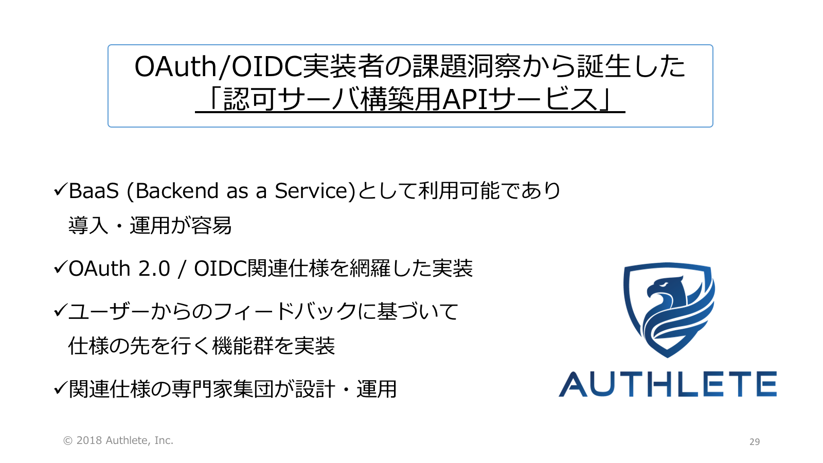 先ほど Justin のほうからも説明がありましたけど、 Authlete っていうサービスを我々はやっています。