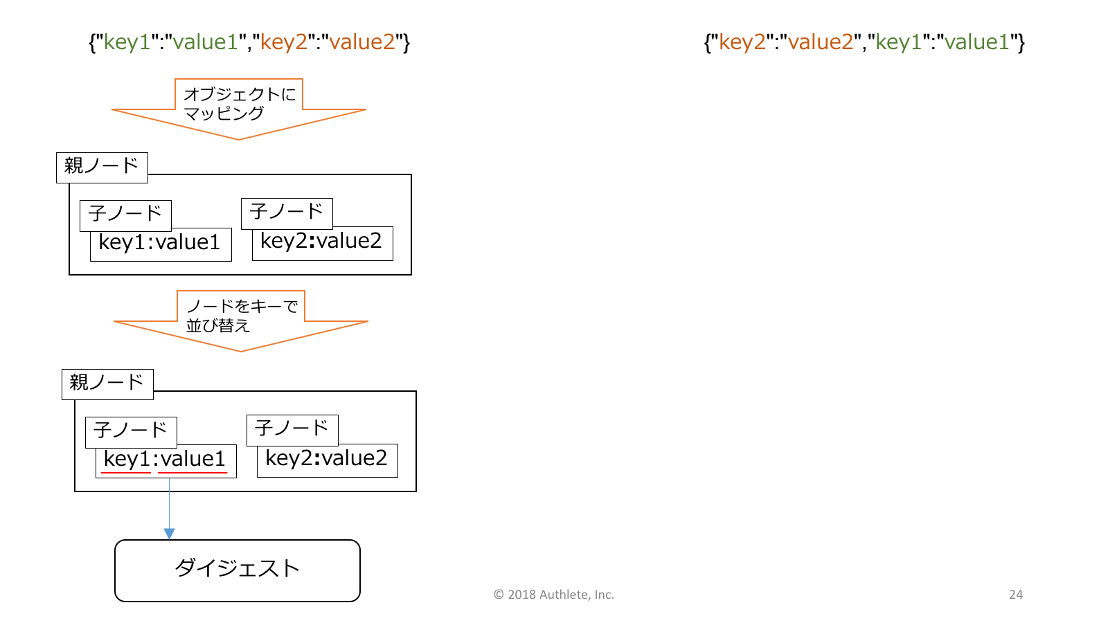 このオブジェクトを、各子ノードの Key を用いて、たとえば昇順とかアルファベット順にソートします。 これはソートしても順番は変わらないんですけど、最終的に各ノードをソートした順番で評価して、 メッセージダイジェストを生成します。