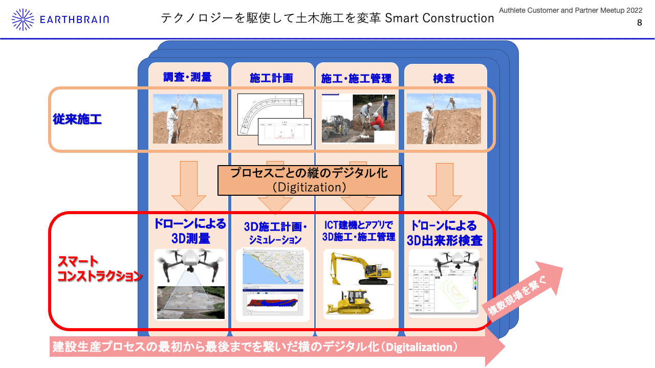 また、3D で表現したものを建機に読み込ませると申し上げましたが、プロセスをまたがって共有すると、さらに生産性が上がっていくことがわかってきました。