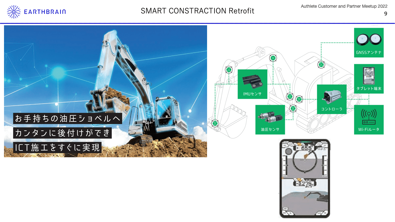 まずこちらの油圧ショベル。道を歩いているとよく見かけると思います。もともと、センサーがついた「ICT 建機」がありましたが、高価であったり、すでに油圧ショベルを持っていたり、という状況がありました。そこで、すでにお持ちの油圧ショベルに後付けできるセンサーキットを提供しています。