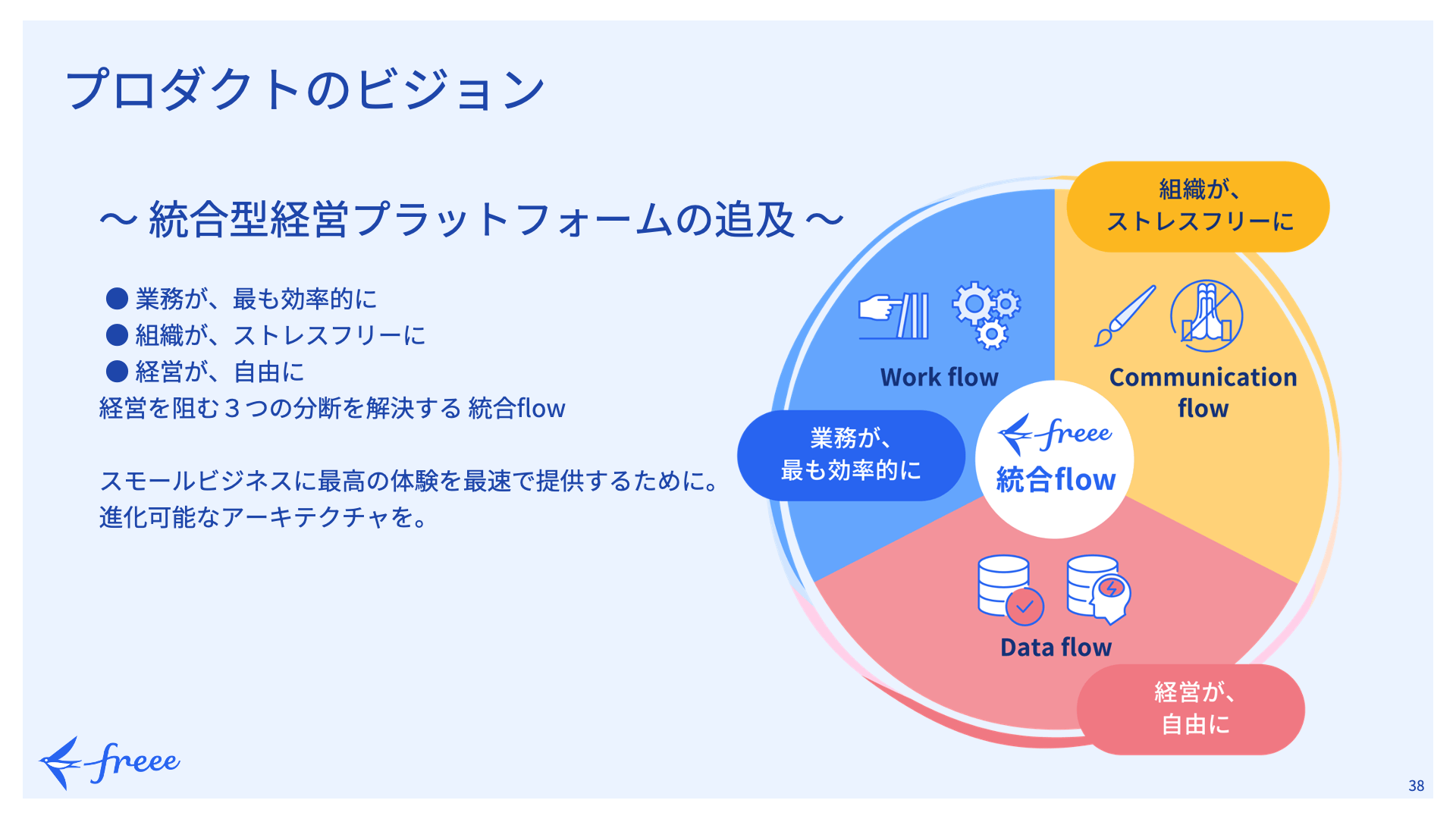 freee は統合型経営プラットフォームを提供しており、これをさらに追求していきます。「業務が、最も効率的に」「組織が、ストレスフリーに」「経営が、自由に」と、経営の 3 つの分断を解決する統合フローを定義しています。