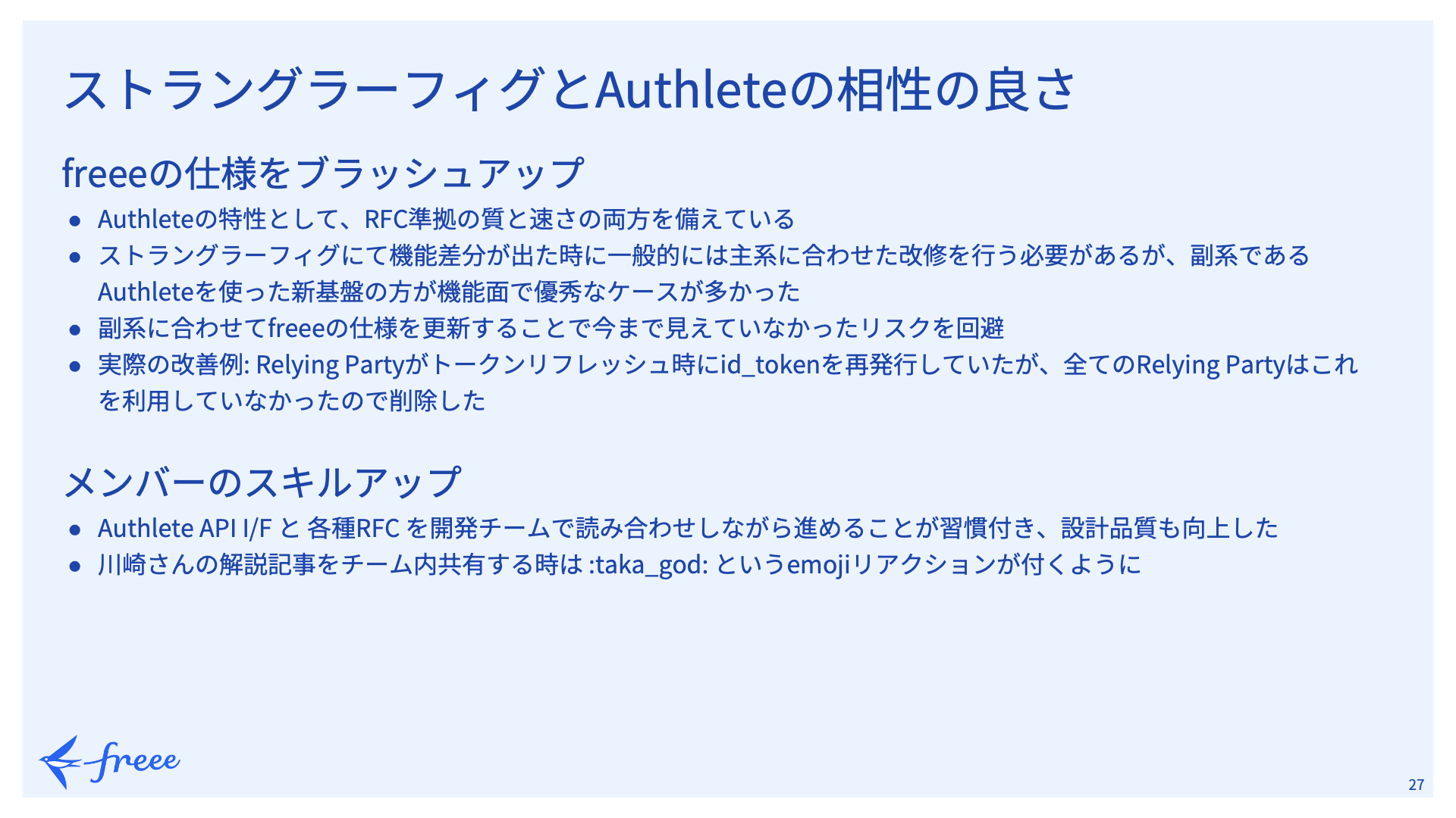Authlete の特性として、RFC 準拠の質と速さがすごいです。ストラングラーフィグパターンではどうしても新旧基盤の機能やインターフェースの差分が出ます。一般的にはその場合、主系に合わせて副系を改修する必要があります。ですが、Authlete を使った副系の新基盤の方が RFC に準拠していて、こちらの方が機能面で優秀なケースが多く見られました。よって、副系に合わせて freee の仕様を更新することにより、今まで見えていなかったリスクを回避できました。
