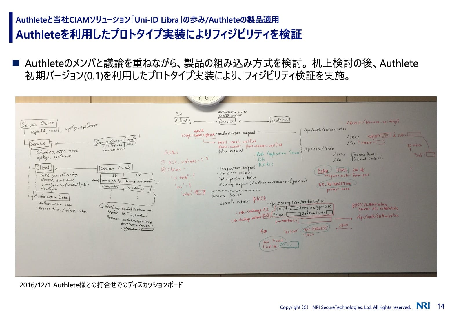 我々の製品にどうやって Authlete を組み込んでいくか、Authlete さんのメンバーと議論を重ねました。ここに貼っている写真は、ちょうど 8 年前の 2016 年の 12 月、Authlete さんが弊社に来られてディスカッションしたときのホワイトボードです。要件に対して、Authlete にどういった機能があって、それをどういう役割分担で、どう組み込めば製品として成立するのか、いろいろ議論を重ねました。そしてまずは机上で検討して、その次にプロトタイプを作ってフィージビリティーを検証、という流れで進めました。