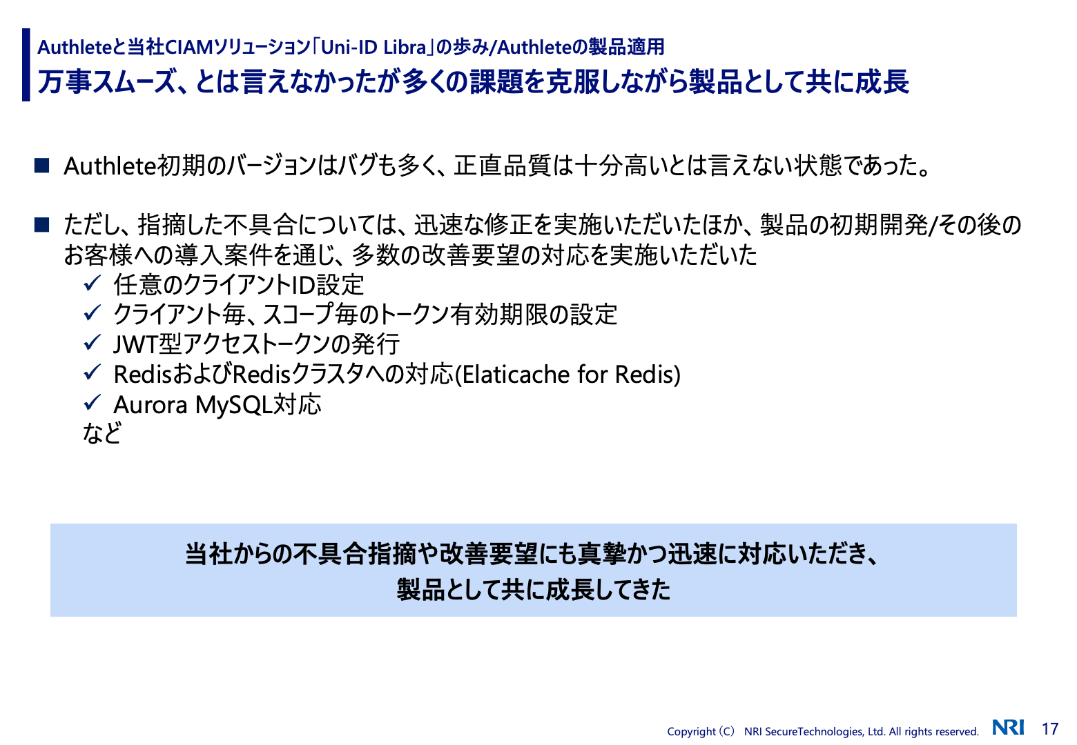 そのほか、製品開発やお客さまへの導入案件を通じていろいろな改善要望を出させていただき、柔軟に対応いただきました。ここに書いてあるところに関しても、Authlete 標準の機能として取り込んでいただくなど、非常に迅速かつ真摯にご対応いただきました。