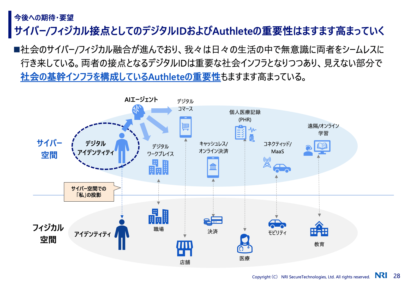 認可も含めたデジタルアイデンティティは、フィジカルな世界とサイバーの空間をつなげる、非常に重要なインフラです。物理的空間の我々をデジタルの世界に投影したのがデジタルアイデンティティであり、そこにいろんなデジタルサービスがつながっています。我々は日々の生活の中で、無意識にフィジカルとサイバーの空間を行き来しながら生活しています。