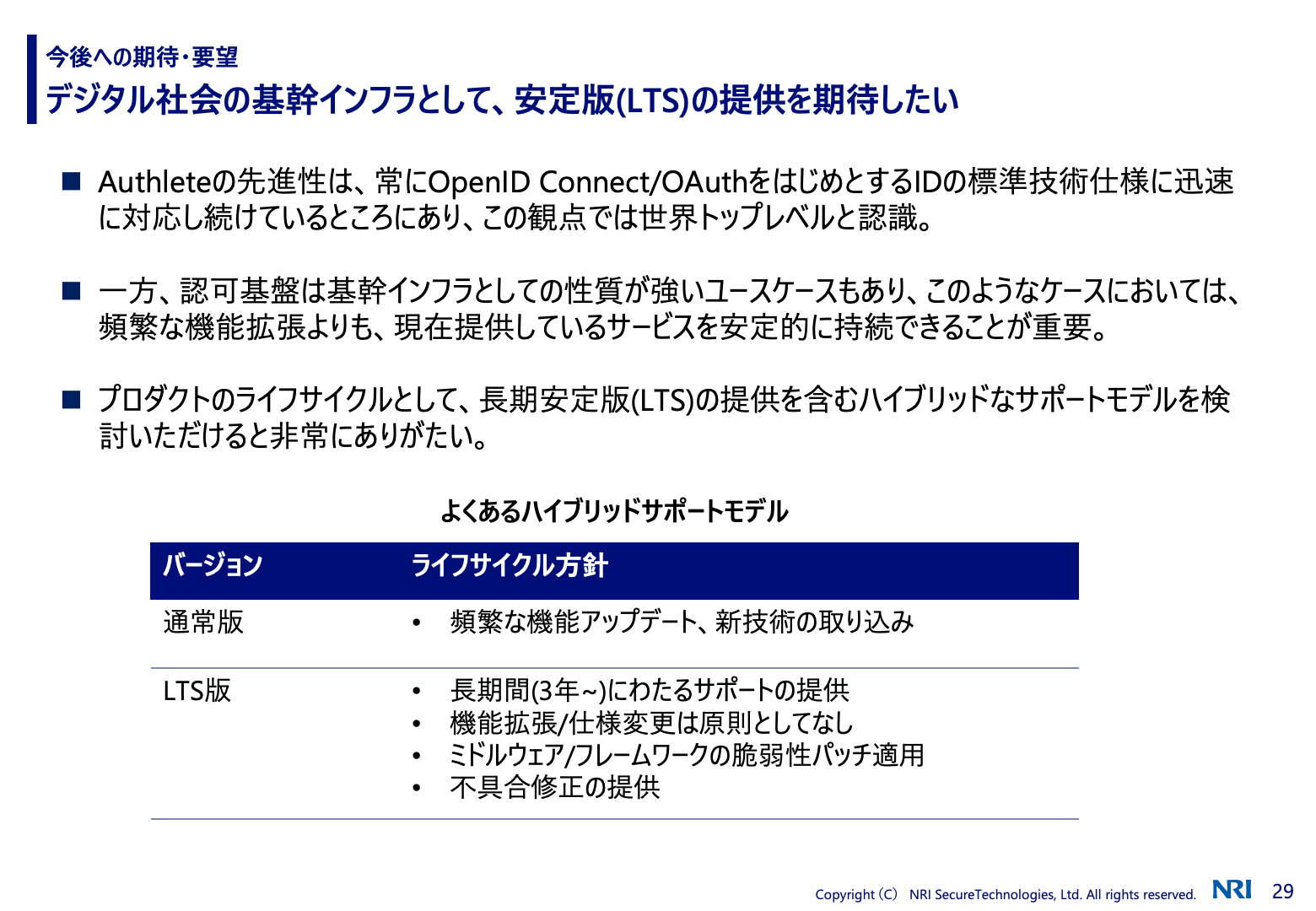 OpenID Connect や OAuth の仕様への準拠とスピードでは、Authlete は世界でも最も優れたレベルにあると認識しています。一方、認証・認可基盤として、金融サービスなど非常に重要な社会インフラで使われるケースもあります。後者においては、頻繁な機能拡張よりも、現在提供しているサービスを安定的・持続的に提供することが求められる側面もあります。プロダクトのライフサイクルとして、どんどん新しいものをキャッチアップしていく通常版と、安定版(Long Term Support 版)の、ハイブリッドなサポートモデルを検討いただけると非常にありがたいです。