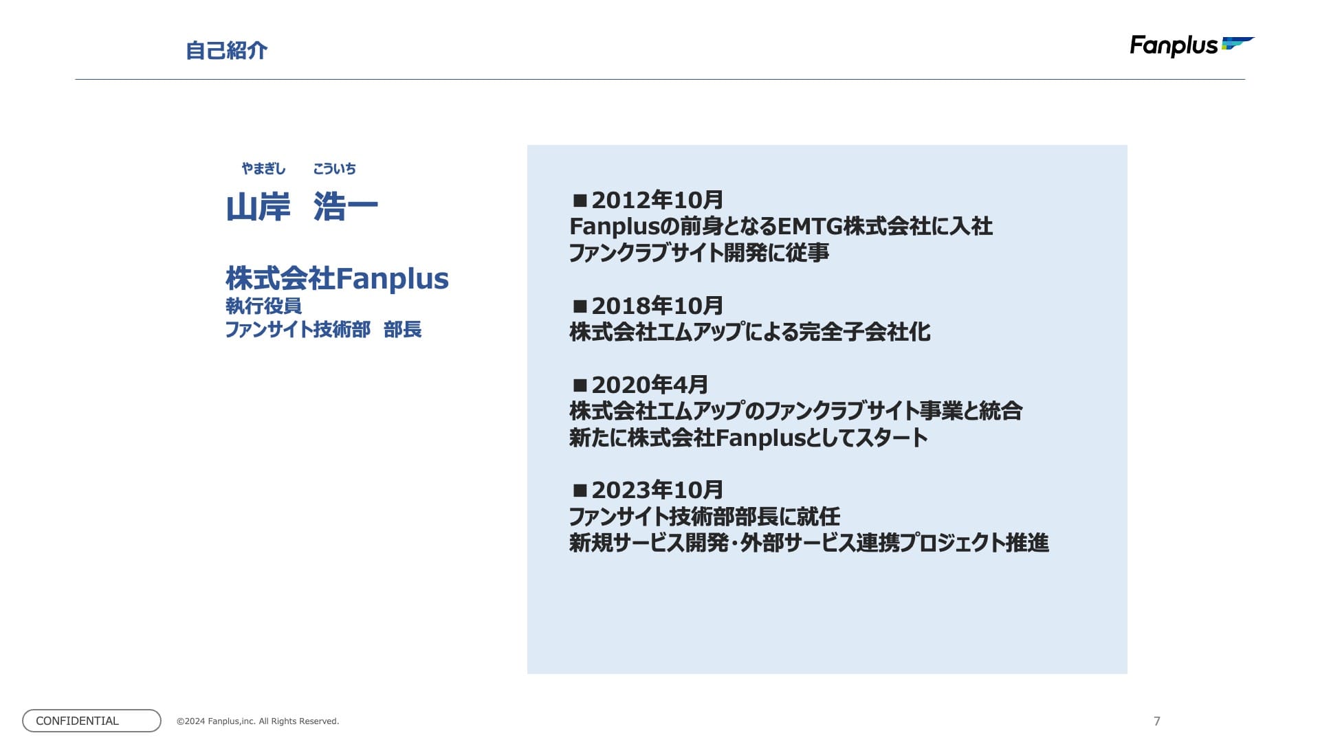 山岸 (Fanplus): 株式会社Fanplusの山岸と申します。現在、ファンサイト技術部の部長と執行役員をやらせていただいております。2012 年に、前身となる EMTG(エンターテイメント・ミュージック・チケットガード)という、チケットの転売を防止する会社から始まって、アーティストが利用するサービスとして、ファンクラブサイト事業の開発をしておりました。2018 年に株式会社エムアップの子会社になってファンクラブの事業を統合、2020 年に現在の Fanplus という新しい会社としてスタートしました。