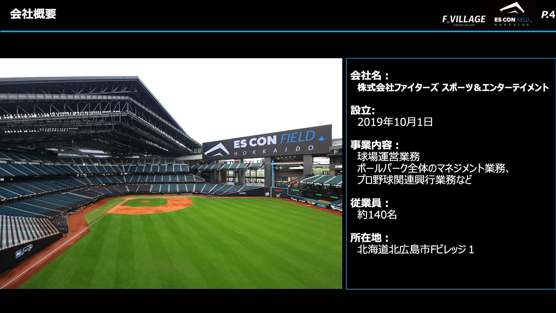 ファイターズ スポーツ & エンターテイメントの設立は 2019 年、比較的新しい会社です。元々は北海道日本ハムファイターズという球団運営会社の中にすべて入っていたんですが、F ビレッジの開発に伴い分社化しました。チームが北海道日本ハムファイターズ、事業・管理部門がファイターズ スポーツ & エンターテイメント、と分かれています。